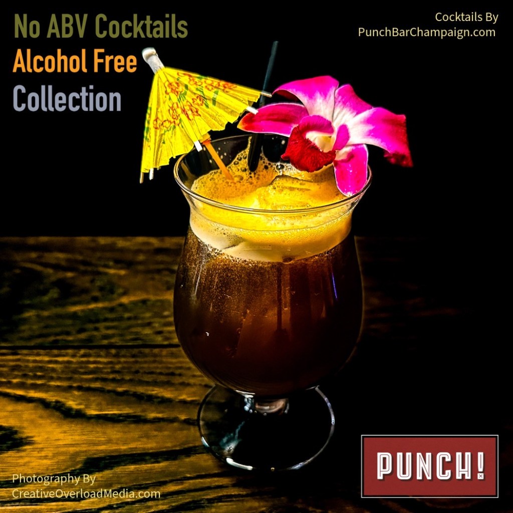 Punch! Bar & Lounge in Downtown Champaign, IL offers a No ABV cocktail menu that features Seedlip non-alcoholic spirits to build a creative and flavorful menu of non-alcoholic mixed drinks.